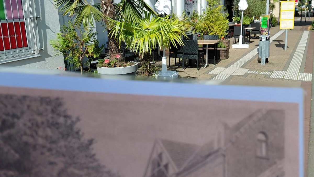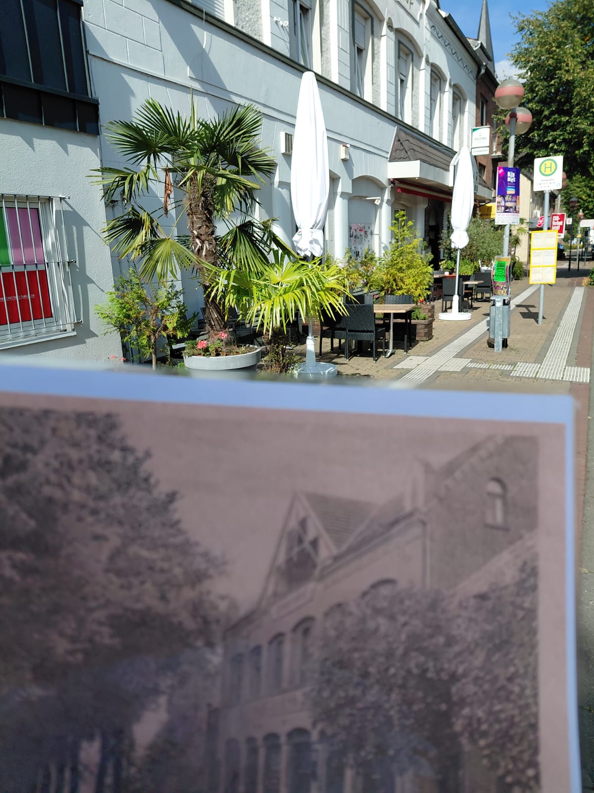 Auf der gegenüber liegenden Seite an der Lindenallee gab es in früheren Zeiten das Hotel „Terheggen“ mit Palmenbiergarten, welches in den 80er Jahren abgebrannt ist, an dieser Stelle befindet sich nun ein großer Gebäudekomplex. Dann ging es weiter über die Burgstraße, an der katholischen Kirche vorbei entlang der früheren Genossenschaftsbank (aktuell Friseurgeschäft und Telefonladen), ehemals Bäckerei und Café Scholten, dort steht jetzt die Amalien-Galerie, es gab Bilder von der vorherigen Sparkasse zu sehen, dann ging es über die Burgschänke, die auch heute noch Bedeutung für den Ort und unseren Verein hat, zur evangelischen Kirche.